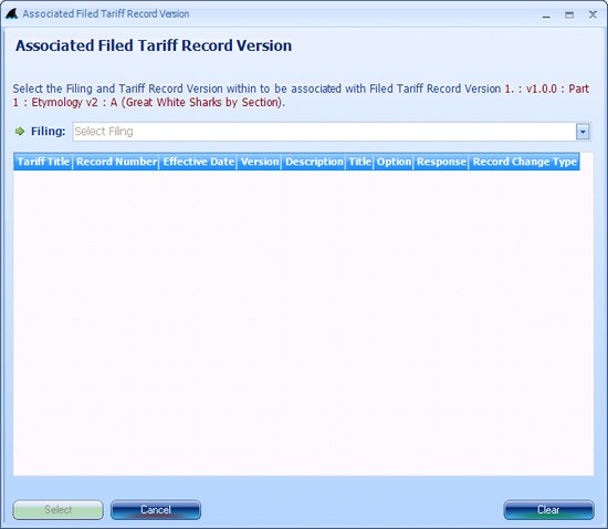 - A popup dialog (Figure 3) is used to associate one Filed Tariff Record Version with another. Select a Filing from the drop-down, then select an FTRV from the grid, and then click the "Select" button to make the association. In order to remove an FTRV's associated FTRV, click the "Clear" button.