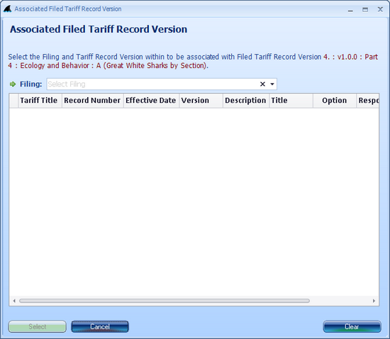 - A popup dialog (Figure 3) is used to associate one Filed Tariff Record Version with another. Select a Filing from the drop-down, then select an FTRV from the grid, and then click the "Select" button to make the association. In order to remove an FTRV's associated FTRV, click the "Clear" button.