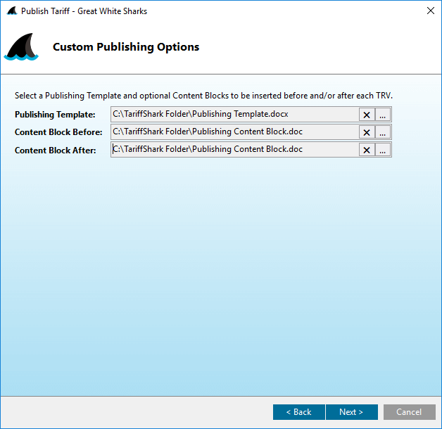 The Publish Tariff wizard's Custom Publishing Options form allows you to specify additional publishing options. Use the ellipsis buttons to choose various files (or drag and drop from your desktop) to customize the published Tariff.