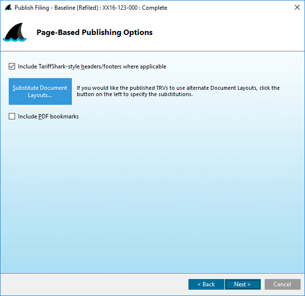 | Include PDF Bookmarks | If this option is checked, TariffShark will include PDF bookmarks in the published PDF. Note that this option is only available when selecting "Page-based, Adobe PDF" Publishing Format in the wizard's TRV Publishing Options form. |