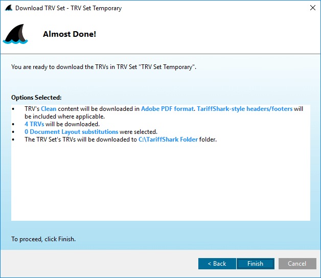 | Finish | TariffShark downloads the TRV Set, saving it as instructed in prior wizard steps and if instructed, opens the folder on your Windows desktop for viewing. |
