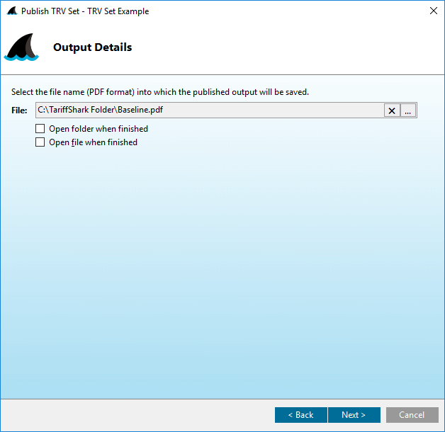 The Publish TRV Set wizard's Output Details form allows you to specify a file name for the published TRV Set and location where it will be stored. You can also direct TariffShark to open the folder location and/or the published document when finished.