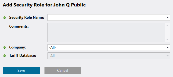 | Tariff Database | Title of the Tariff Database through which the User is assigned the Security Role. The value -All- here means that the User is assigned the Security Role for all Tariff Databases. You must select a Company first in order to further restrict the Security Role to a specific Tariff Database. | Yes |