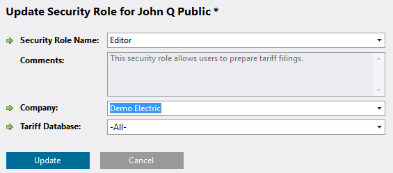 | Tariff Database | Title of the Tariff Database through which the User is assigned the Security Role. The value -All- here means that the User is assigned the Security Role for all Tariff Databases. You must select a Company first in order to further restrict the Security Role to a specific Tariff Database. | Yes |