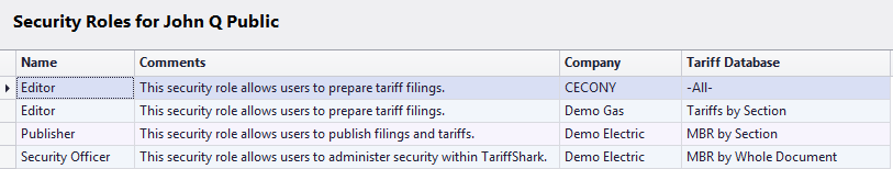 | Tariff Database | Title of the Tariff Database through which the User is assigned the Security Role. The value -All- here means that the User is assigned the Security Role for all Tariff Databases within the Company shown. |